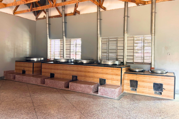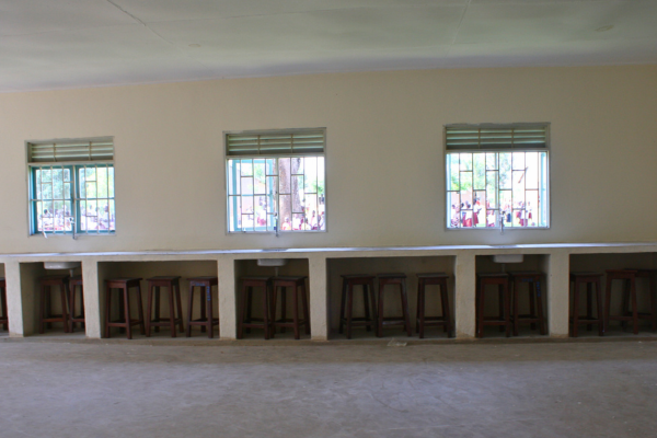 Today, the meals are prepared in a kitchen complex (state-of-the-art by Ugandan standards) with much more efficient stoves with chimneys to take away the smoke and nearby storage rooms for food and supplies. Once the meals are prepared, the kids line up to get served and eat in Berrigan Hall, a beautiful terrazzo-floored building with room for 800 students to dine.