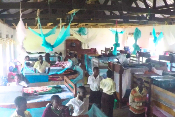 The next stop on the tour was the makeshift girls’ dormitory that had been set-up in the small community hall adjacent to the church. Somehow, they managed to accommodate over 100 girls in the moderately sized room by cramming in bunk beds, stacked three-high with little room to move between them. While the crowded room was undoubtedly stuffy on the warm Uganda nights, it was still an upgrade over the floors of classrooms or local mud huts where the boys would bed down.