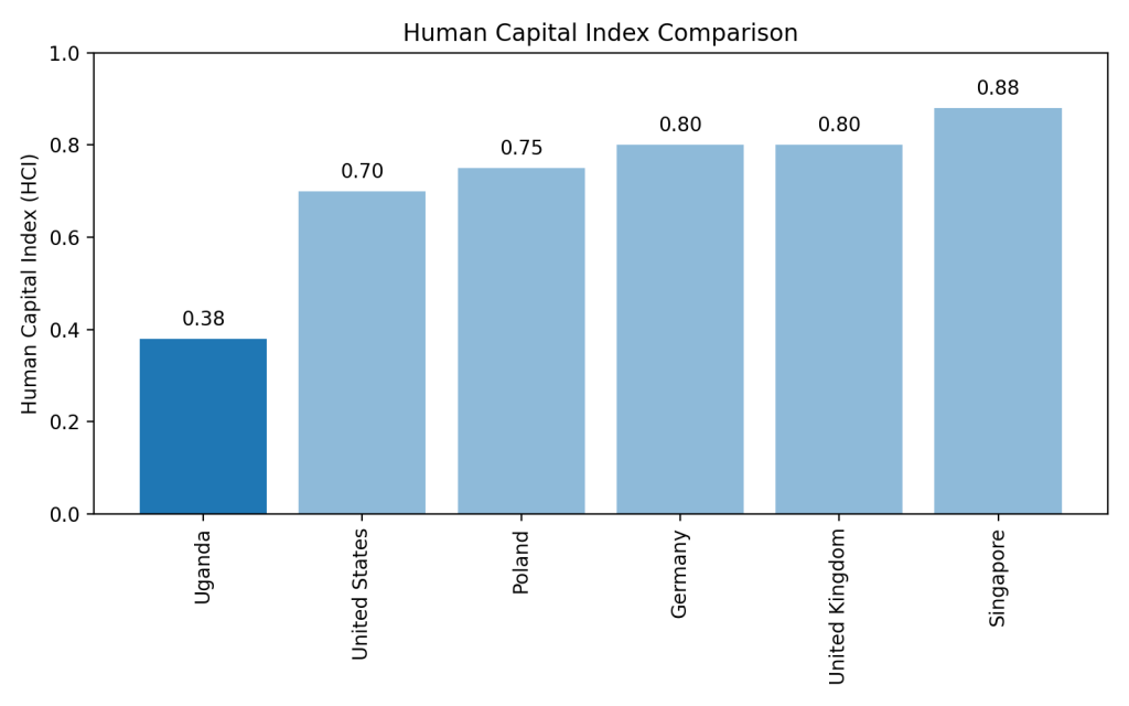 Uganda’s HCI score is a dismal 0.38, meaning that children born today are expected to reach only 38% of their full productivity potential as adults.